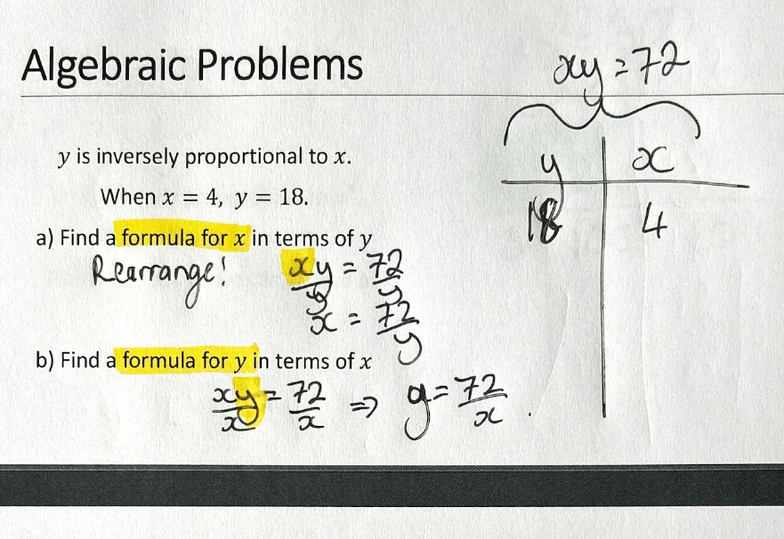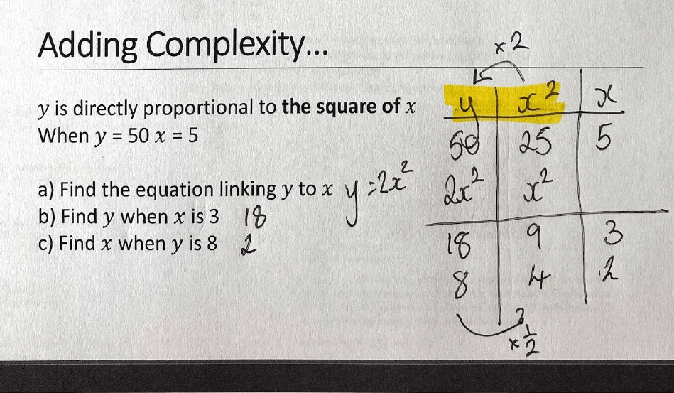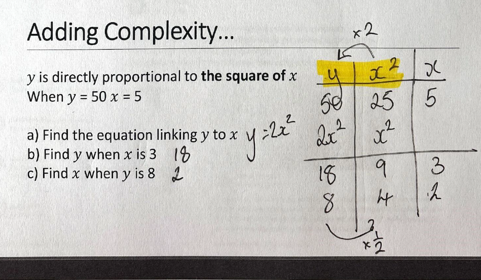We set up tables with the information from the question, giving our tables headers for each variable, and look for the multipliers within and between them. We can then generalise by placing one variable in its column and completing the relevant multiplication – then we’re gifted with the algebraic relationship. (see the blue and yellow highlights below).