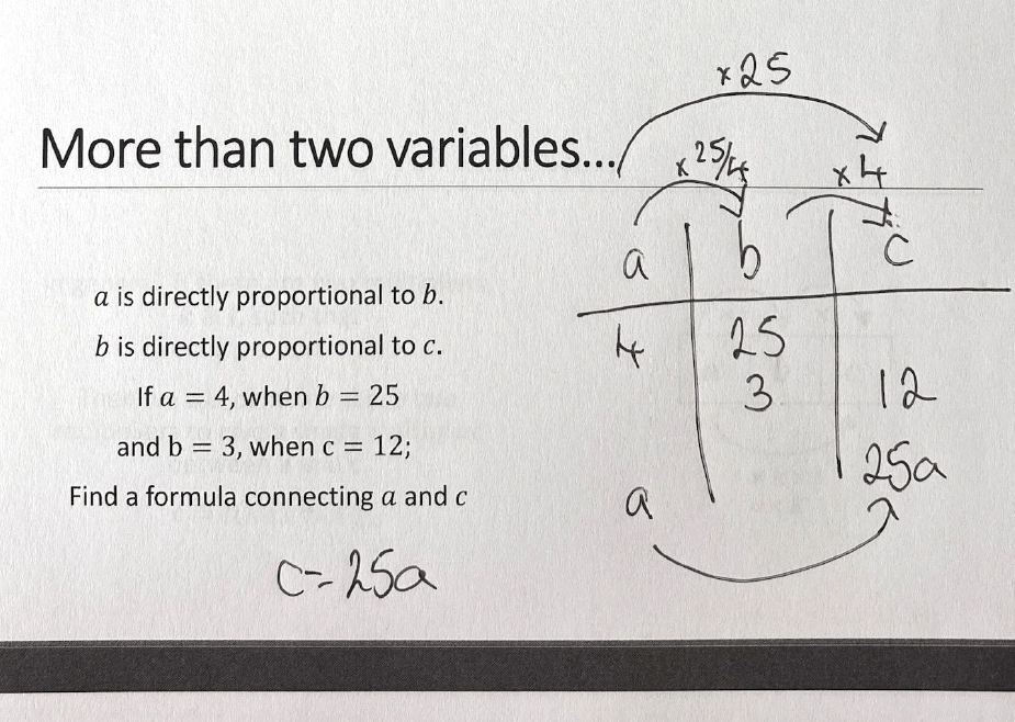 Remember that the aim here is that students have an understanding of these two relationships and to easily show it. For me, this method is an important part of my initial instruction for all students to ensure they have deep conceptual understanding of proportion and the ability to generalise these relationships between variables. But that is not to say that generalising to use the formulae should be avoided entirely (just like with compound measures). Ratio tables should be a helpful tool in students’ arsenal; a way to build up understanding, not the ‘method’ that should be used at the exclusion of others or stopping students to develop more efficient methods.