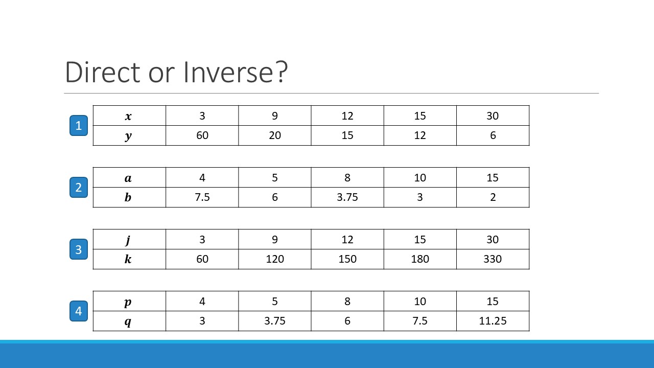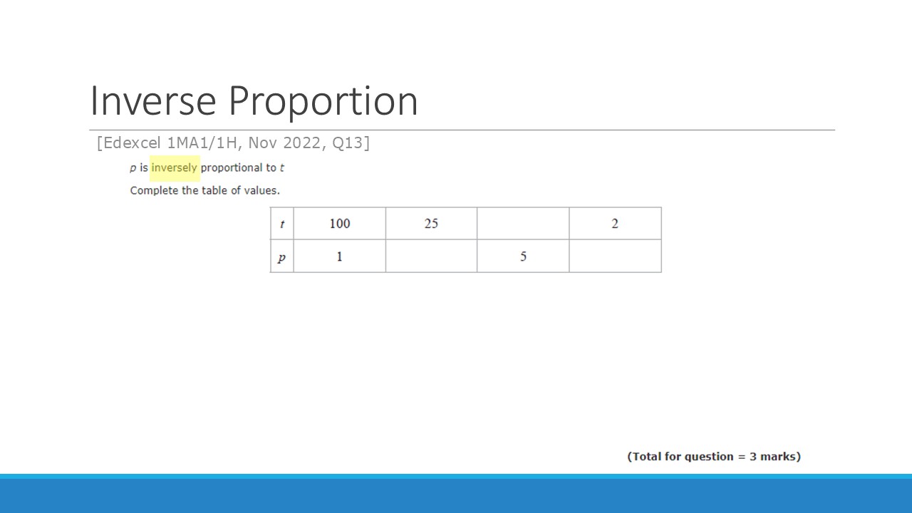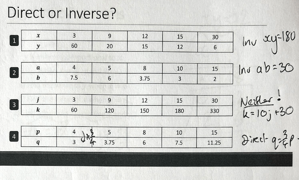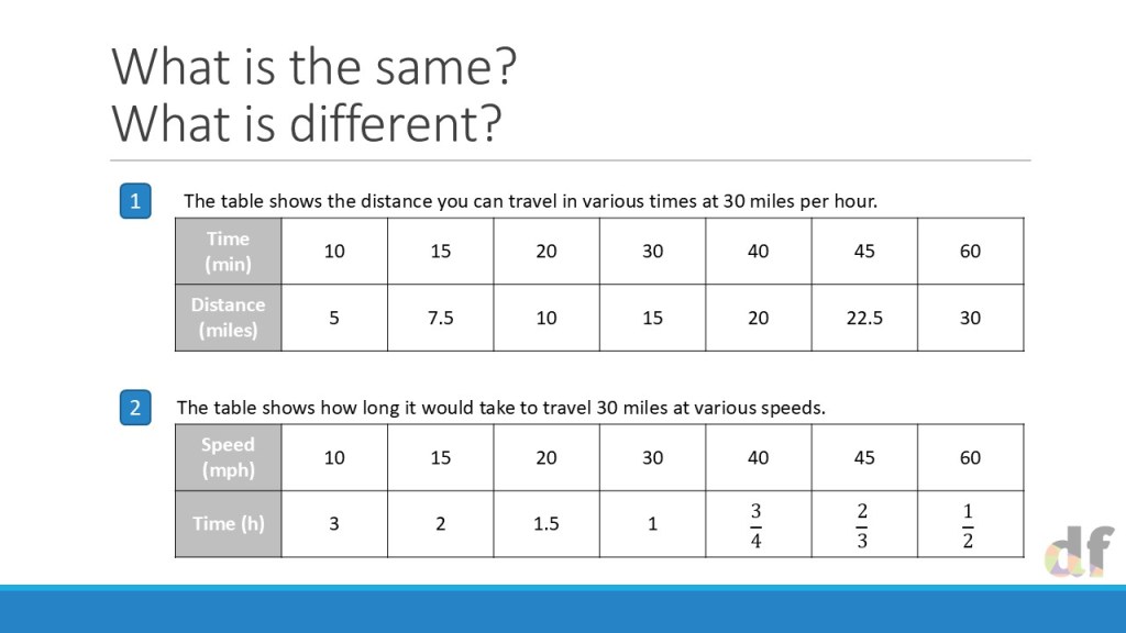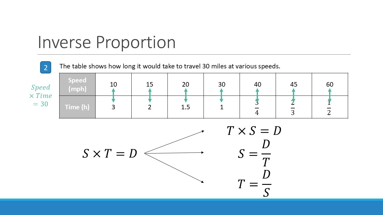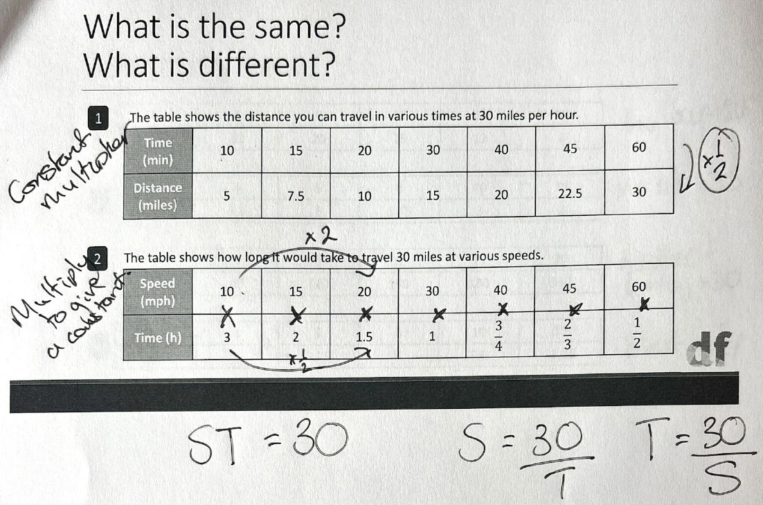 Once I had this settled in my head, it became about showing students how to look for this relationsip between variables, and differentiate it from a direct proportion relationship. So I made it part of my exposition, initially by comparing the different variables in the (now very familiar) speed-distance-time relationship, and then ensuring students had sufficient practice of telling the difference between relationships that are direct, inverse and neither.