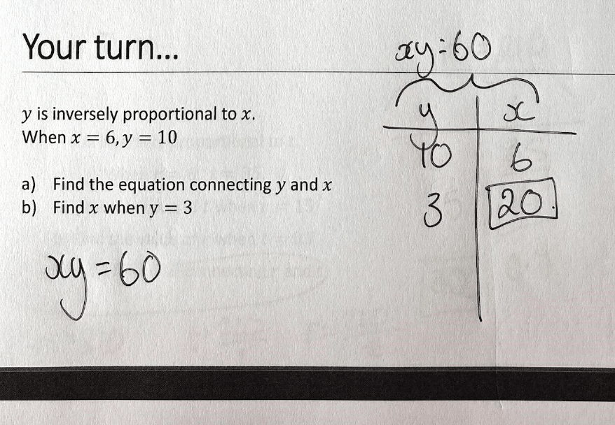 It took me a while longer to work out how this translated to inverse proportion problems. I didn’t want to use a totally different structure for these – the ideas are too linked. But I was worried about how students would know the difference between them. The lightbulb moment for me was noticing that the ‘diagonals’ of the direct proportion boxes work in the same way as an inverse proportion relationship – they have a constant product. And I made sure my students were confident with this through my teaching of direct proportion, so I knew they could handle the maths behind it.