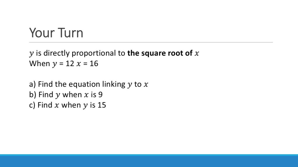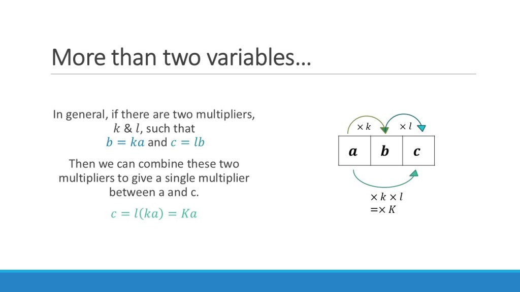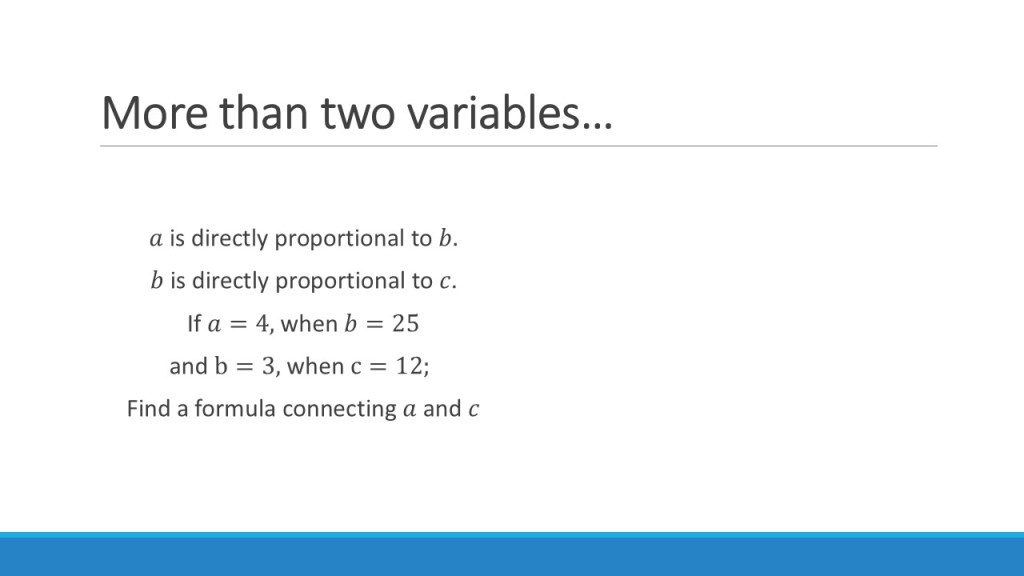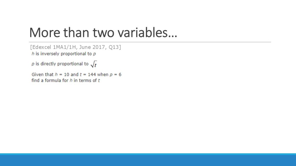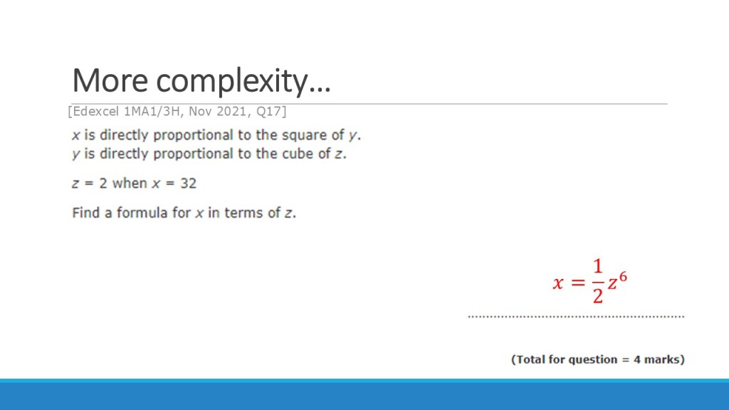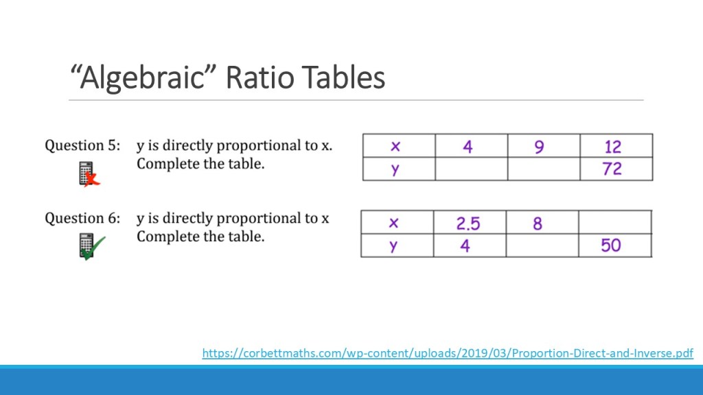 An important example of this is questions that combine direct and inverse relationships, as mentioned above. For these, I will say that insisting on working in the table adds unnecessary complexity. It can get very messy to deal with these all at the same time in a table. I would want students tackling these kinds of problems to be able to work with the algebraic form from the beginning, and not be reliant on a ratio table at this stage. I’d argue that the table is really useful for developing fluency with the numerical forms of these relationships, and moving confidently between the types of proportion is essential for the “machine-day” style questions. However, those that require writing an algebraic relationship between variables of different types of proportion should probably not be tackled in a table – and if students are not at a point of being able to use the algebraic form, work needs to be done to help them to do so before tackling these types of question.