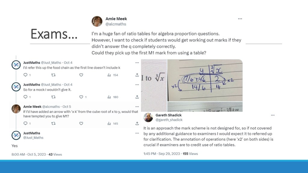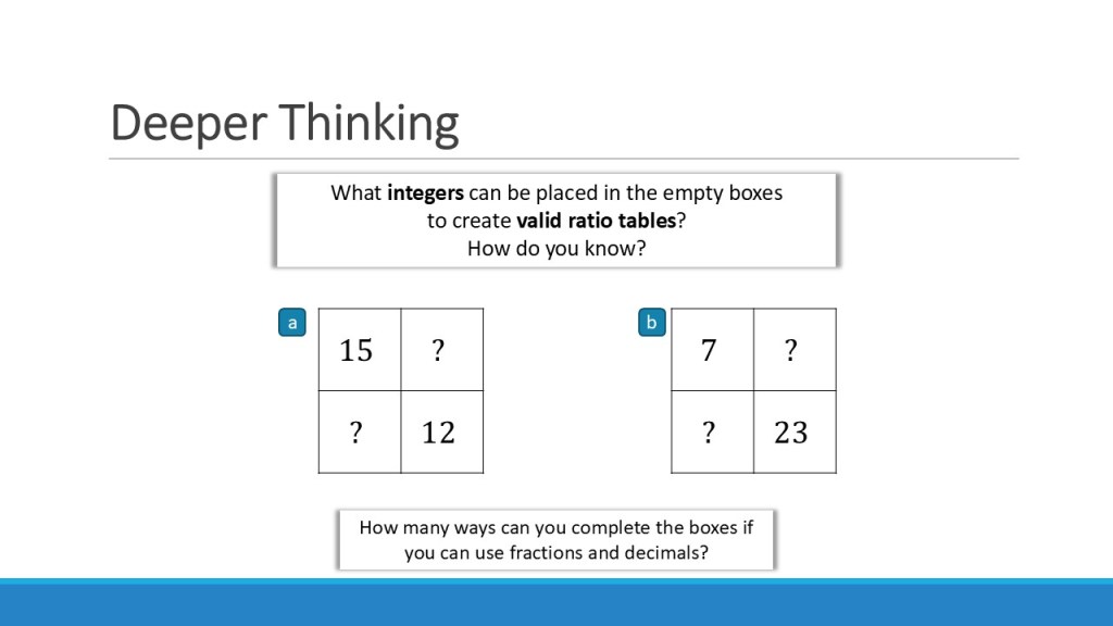 In that last blog/session, I began to share my methods for using ratio tables for algebraic problems, but I didn’t feel I did it as much justice as I wanted to. As you can see in that blog post, that I had a bit of post-COVID brain fog, and I also just tried to cram way too much into one session… so after being asked about it more since MathsConf33, I thought that I would try it again, with the benefit of hindsight and some more time to let the ideas mature. In this session, I talked a lot less, live modelled a large number of questions and then let the delegates have a go themselves to see the power of the representation.