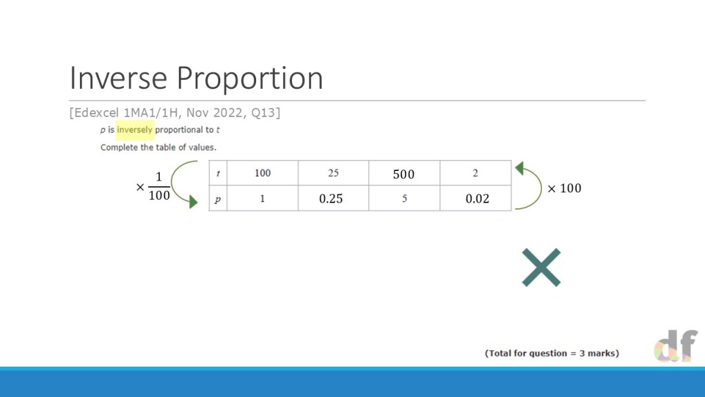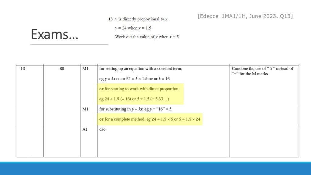 Thankfully, the answer is yes. Historically, M1 marks (in Edexcel GCSE, at least) were given for writing something like y=kx as the first line of working, however ‘any valid method’ should be marked correctly by an examiner or referred up the chain if they are unsure. In the case of proportionality, this translates as understanding the multiplicative nature of the relationship between the variables. Which means when using the ratio table method, the multiplier between the variables just needs to be noted explicitly. This has been reflected in mark schemes over the last few years.